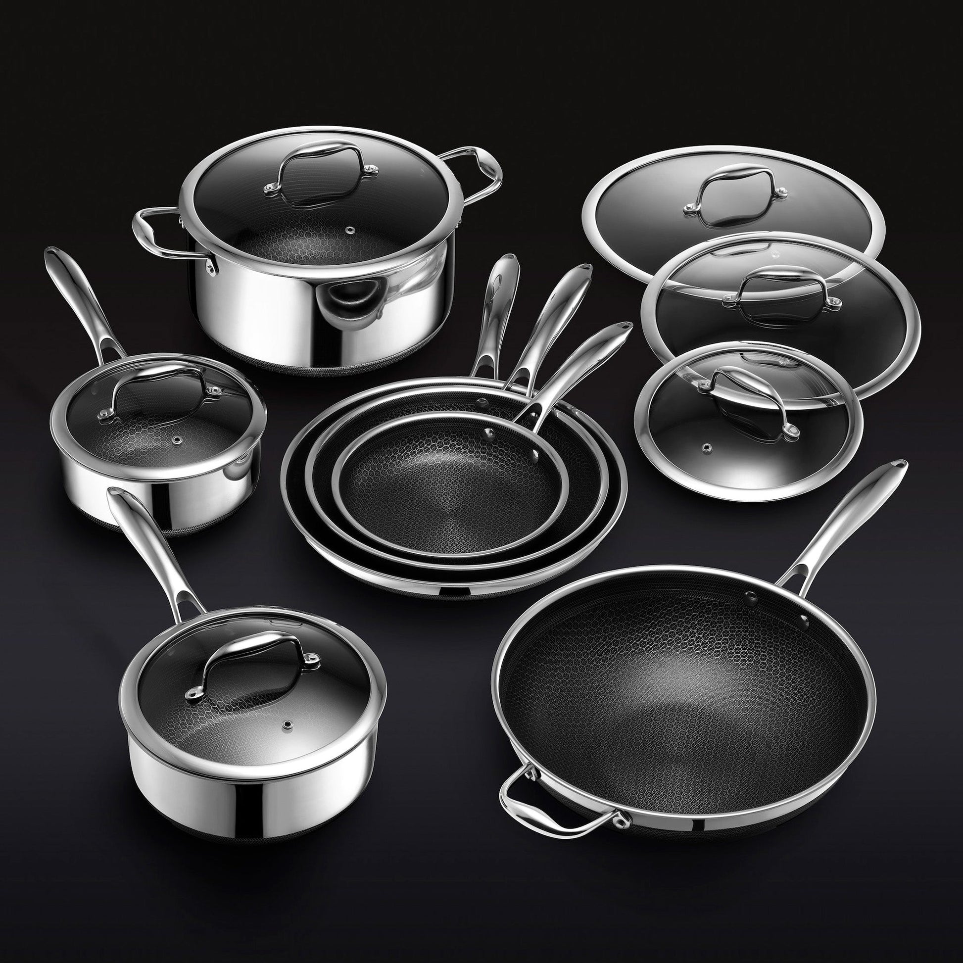 13-Piece HexClad Hybrid Cookware Set with Lids – Non-Stick, Stainless Steel & Cast Iron Fusion