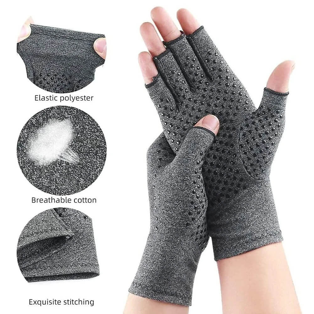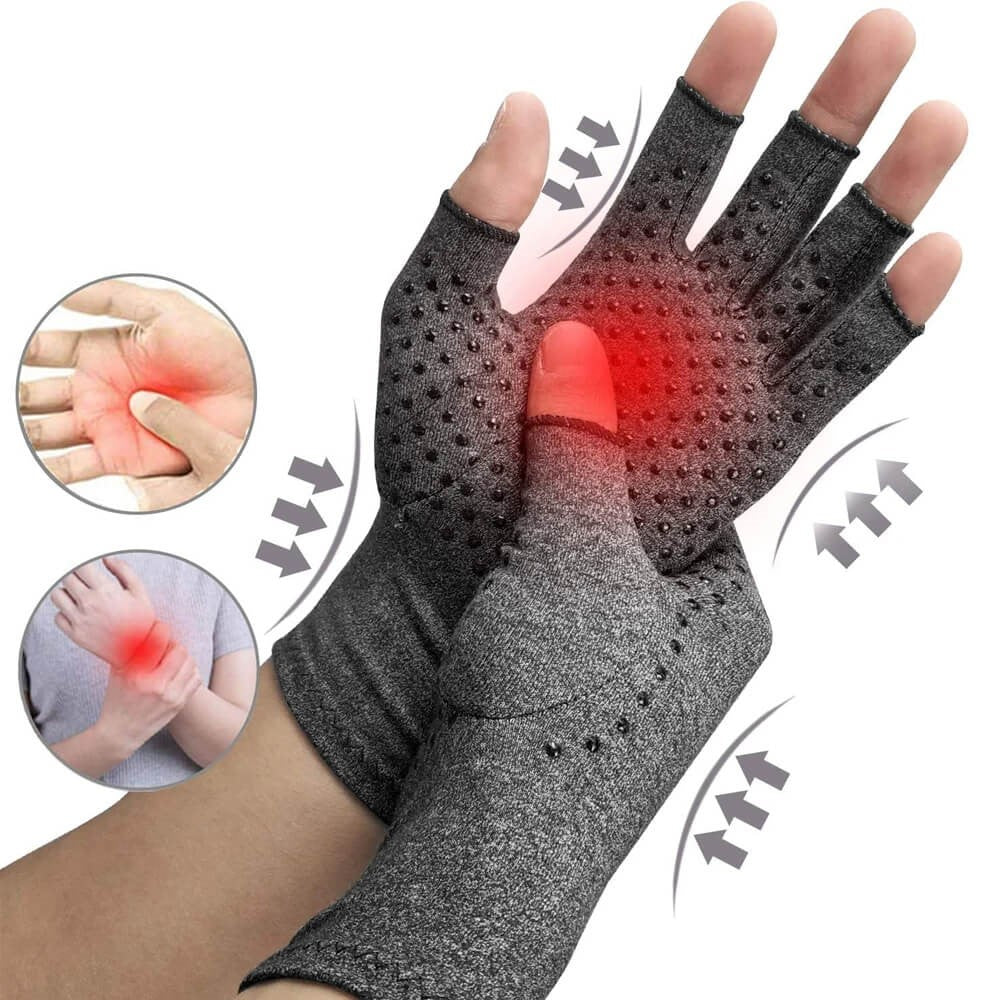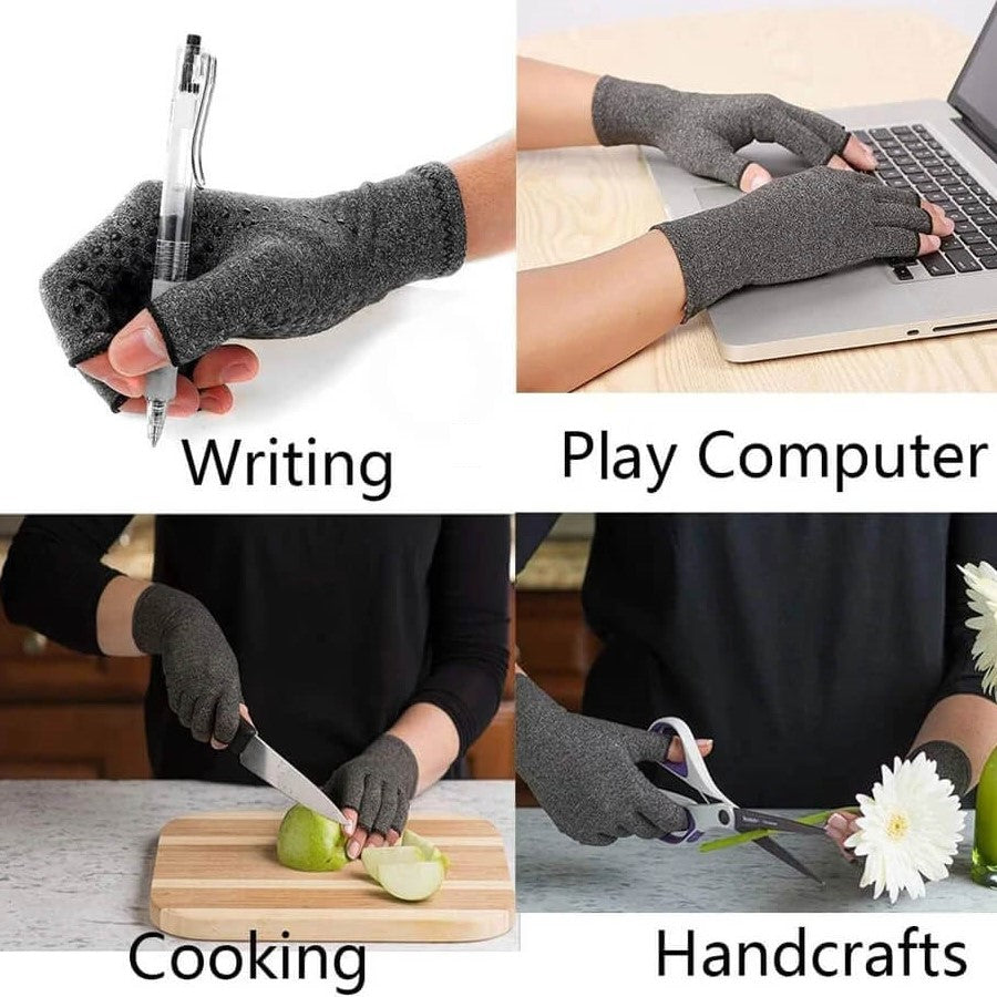 The gloves provide gentle compression and therapeutic warmth that improve blood circulation, reduce swelling, and support joints, which helps relieve arthritis pain and stiffness.
