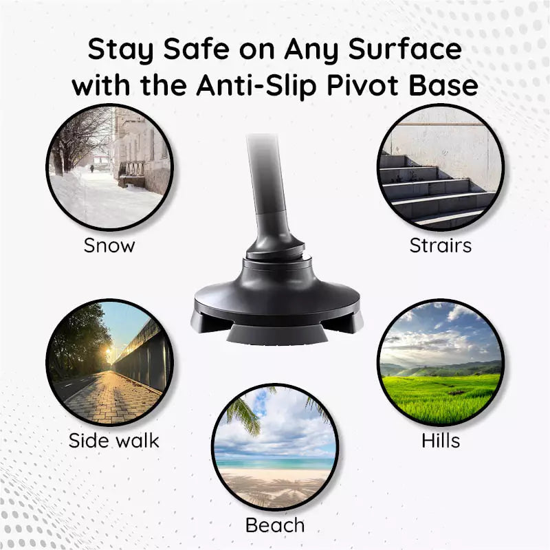 Its quadruple treaded base can support your full weight, preventing any potential slip-and-fall events and providing peace of mind. The base allows it to stand on its own, providing a safe and comfortable support.
